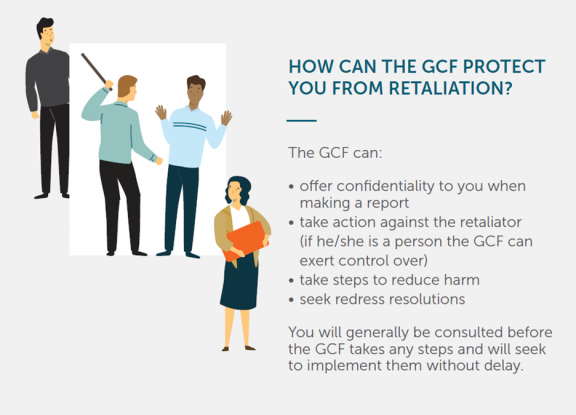 Mfuko wa Hali ya Hewa ya Kijani (GCF) Haivumilii ulipizaji kisasi. Hii inaonyeshwa katika sera mbili maalum, yaani, GCFSera ya 'Ulinzi wa Whistleblowers and Witnesses (PPWW) na Sera ya Mazoezi ya Marufuku (PPP). Kulipiza kisasi dhidi ya Whistleblowers na Mashahidi ni mazoea yaliyokatazwa. PPWW inasema wazi kwamba Whistleblower au Shahidi anaweza kuwa mtu ambaye huleta madai na habari katika malalamiko, malalamiko au ombi la kufikiria upya kwa IRM. Chini ya masharti ya Sera juu ya Mazoezi ya Marufuku, kulipiza kisasi kunaweza kusababisha, kati ya vitendo vingine, kwa kuweka vikwazo vya utawala au hatua za kinidhamu / za kurekebisha juu ya GCF wafanyakazi, kwa kufuta au kusimamishwa kwa GCF mapato ambayo yametengwa kwa chama kinachohusika katika shughuli zinazohusiana na mfuko, na kutostahili kwa chama hicho kushiriki katika siku zijazo GCF-shughuli zinazohusiana. Chini ya PPWW, filimbi na mashahidi hutolewa ulinzi muhimu na tiba dhidi ya kulipiza kisasi. (Kwa dalili zaidi, tafadhali rejea Sera ya Mazoezi Yaliyokatazwa.)